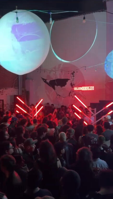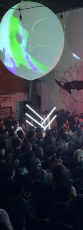 The sphere itself presented another challenge. Hanging an 8-ft inflatable latex orb from a 14-foot cord drilled securely into the walls required careful planning and teamwork. From the moment it hovered in the air, it became a running joke among the crew for looking like a giant piñata. By the end of the night, the prospect of taking it down was daunting. Venue staff were insistent—everything needed to be cleared immediately. But after hours of intense setup, dismantling it with care was out of the question. So, we gently poked it and let it slowly deflate, a strangely satisfying ritual that marked the end of the event as if the installation itself were exhaling.